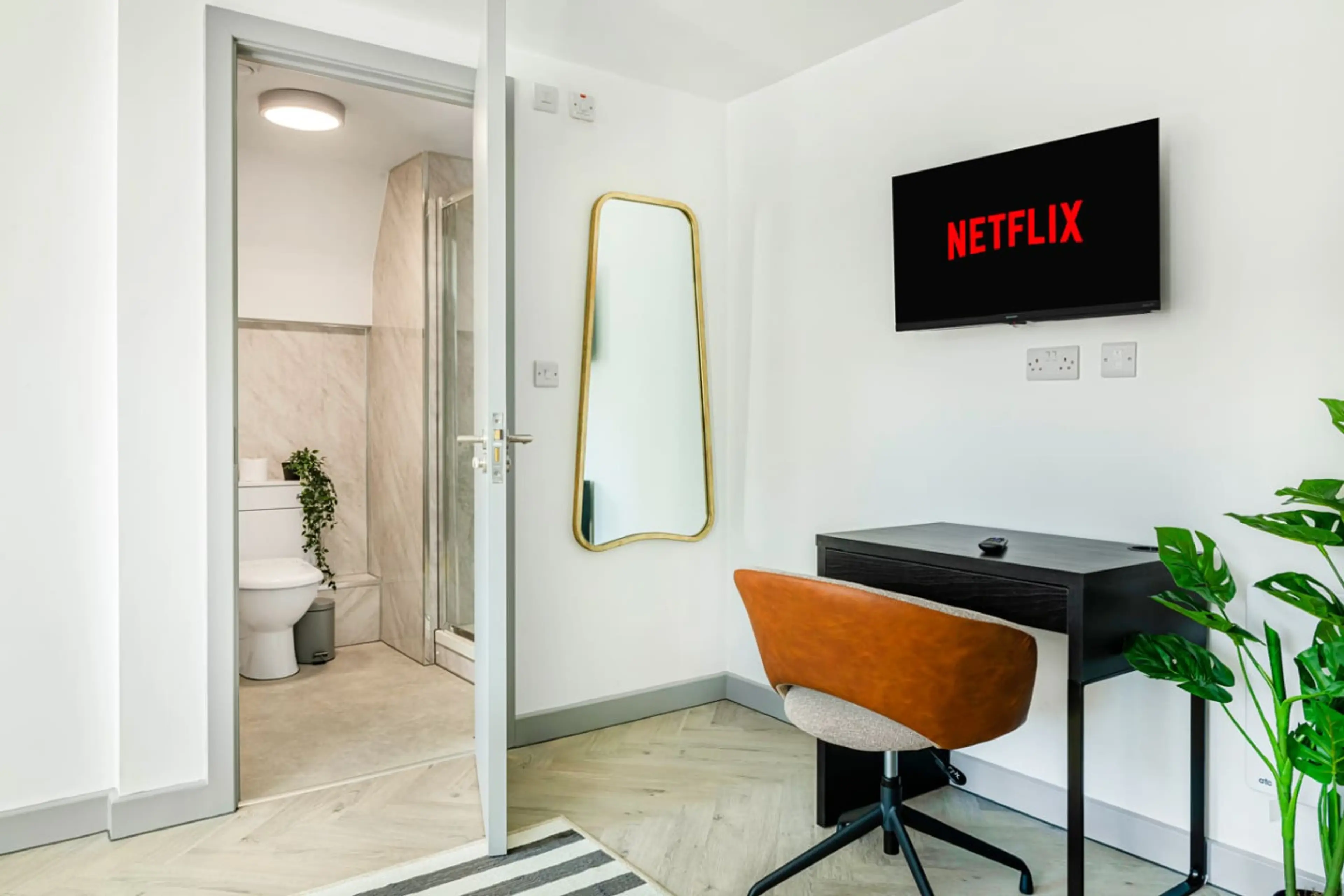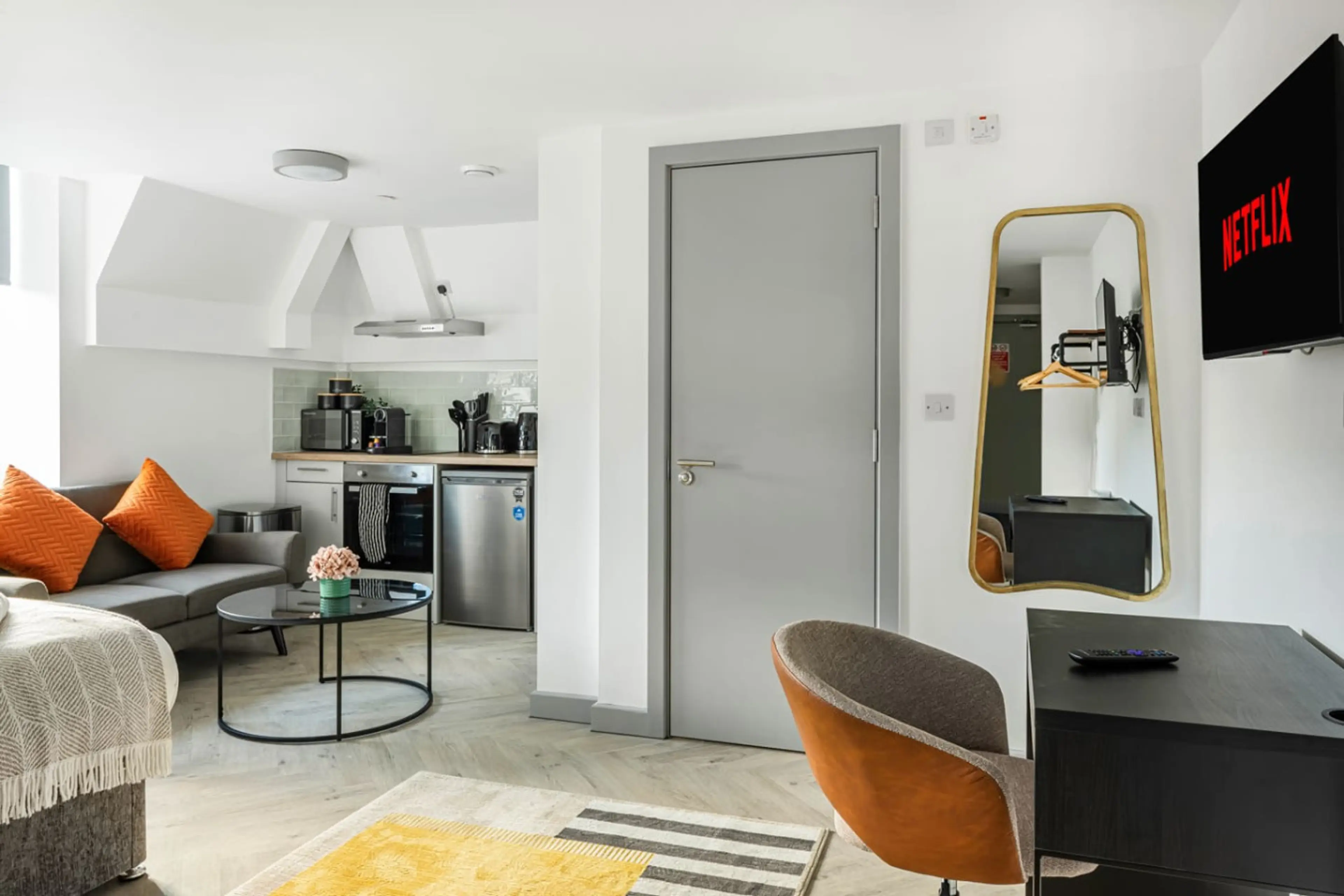 Enjoy your stay in this modern and thoughtfully designed studio apartment in the heart of Nottingham. Perfect for solo travellers or couples, the space features a cosy double bed, ensuite bathroom, and a fully equipped kitchen for all your self-catering needs. Stylish touches, natural light, and con...