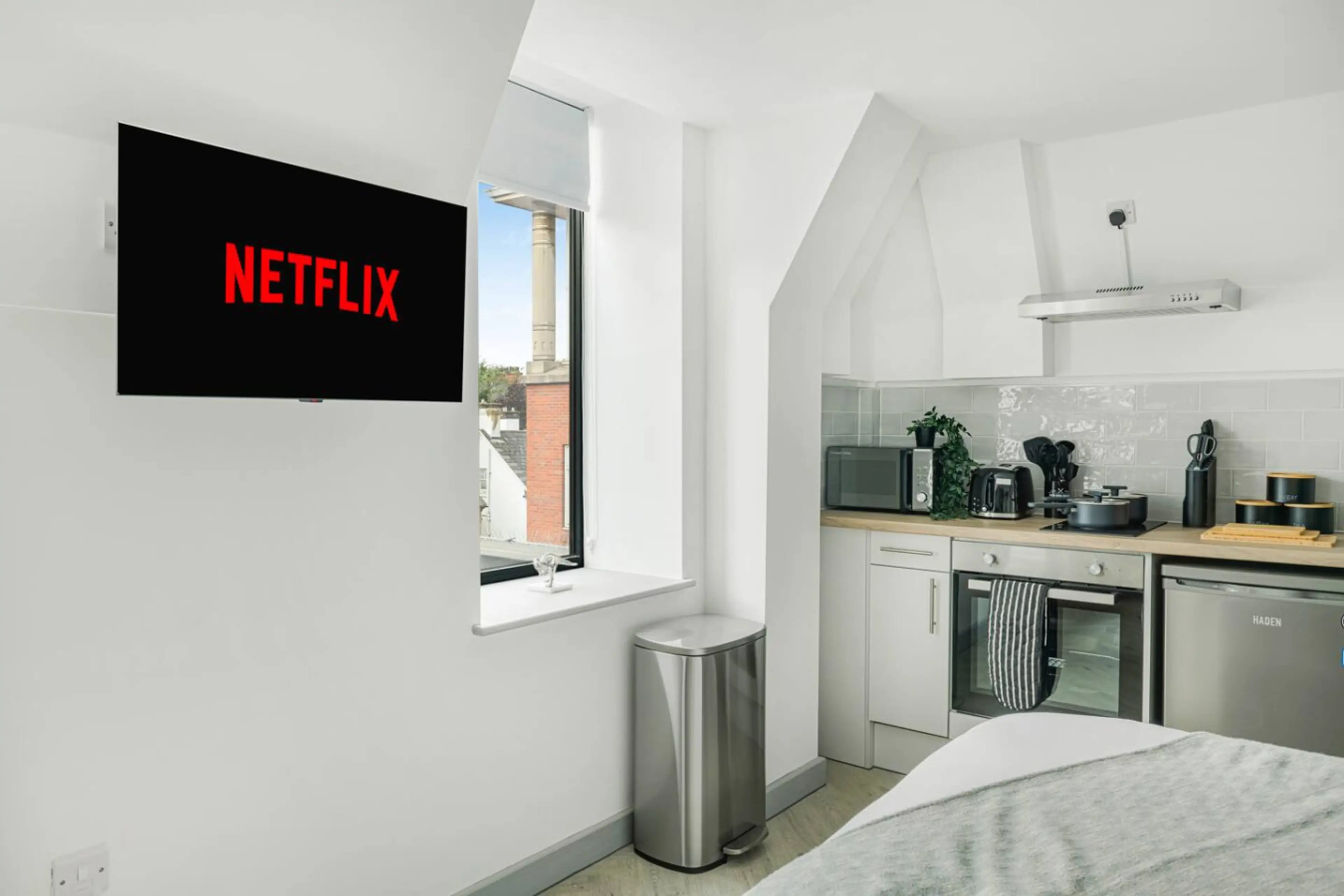 Stay in a beautifully furnished studio right in the heart of Nottingham. Set on the top floor of a landmark building, each studio features a full kitchen, modern ensuite, and stylish décor — perfect for solo stays or couples. You're steps from the square, nightlife, shops and transport. A peaceful...